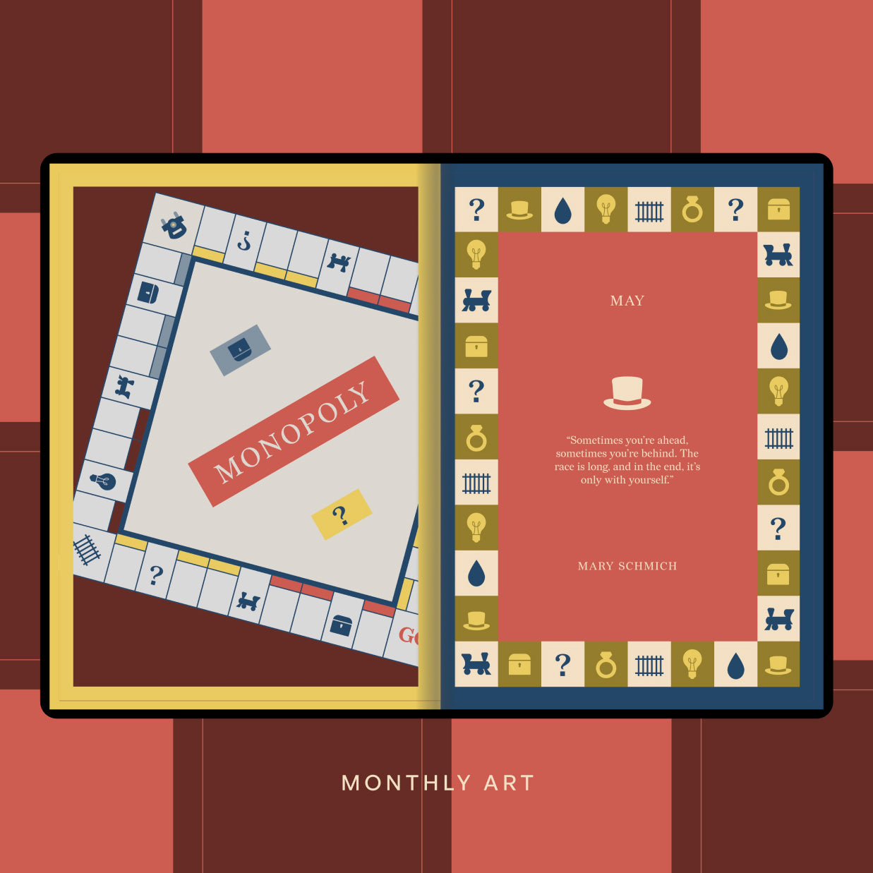 - Monthly Art: Original Artwork inspired by board games accompanied by quotes on life and success.