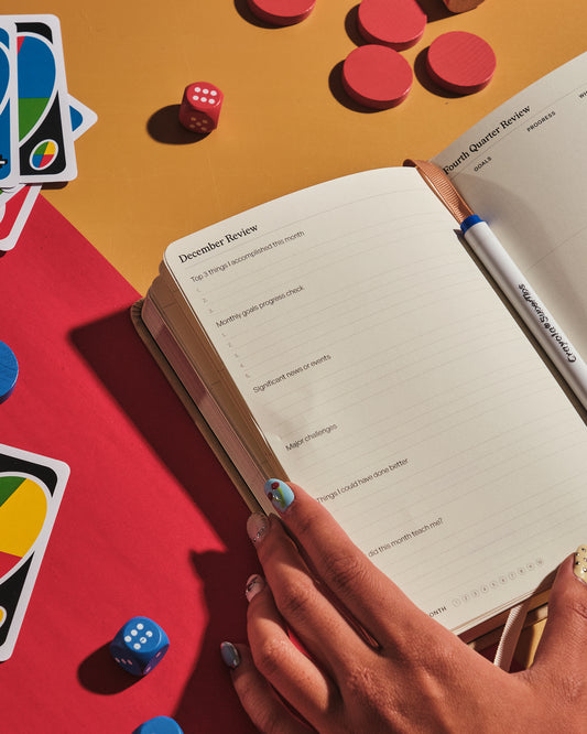 The Balance Keeper is available in 3 Balacron hardbound covers—Ink, Sand, and Indigo. Each planner features a carefully debossed logo and year, offering a subtle yet elegant design.